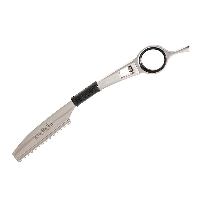Парикмахерская бритва для стрижки + 5 лезвий в комплекте. Изготовлена из металла с резиновой вставкой против скольжения в руке при стрижке. Бритва оснащена поворотным кольцом для более комфортной работы парикмахера.