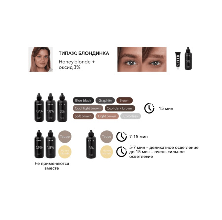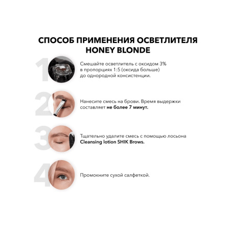 Осветлитель Honey blonde подходит для плотных волосков на бровях. Создает более нейтральный фон и осветляет на 2-3 тона.