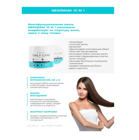Многофункциональная маска Mesomask 10 in 1 для мгновенной реанимации волос комплексно воздействует на структуру волос, корни и кожу головы.
