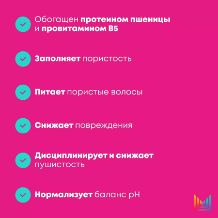 Легкая текстура сглаживает поврежденную кутикулу, дисциплинируют пушистые пряди, увлажняет, а также нормализует баланс pH.