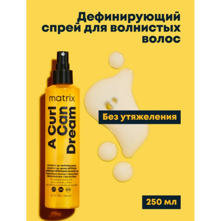 Склонные к пушистости волнистые волосы без выраженного завитка нуждаются в невесомом увлажнении. Профессиональный бренд Matrix предлагает эффективный подход к текстурированию, совмещающий интенсивный уход и очерченность волн. Дефинирующий спрей Scrunch N’Go на длительное время снимает пушение, очерчивает и выделяет волны, сохраняет легкость и воздушную подвижность волнистых волос.