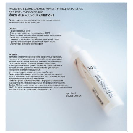 Лёгкое мультифункциональное средство с мгновенным действием — идеальный помощник в уходе за волосами любого типа. Благодаря насыщенной формуле с коллагеном и увлажняющим комплексом молочко моментально разглаживает пряди, облегчает укладку и защищает от негативного влияния термоинструментов и окружающей среды.