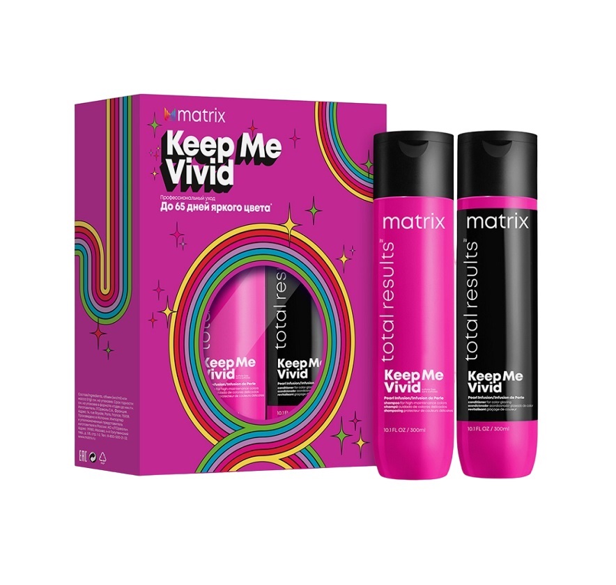 Шампунь без сульфатов Keep Me Vivid бережно очищает, помогает сохранить яркий цвет окрашенных волос до 65* дней, а жемчужная пудра придает дополнительное сияние.