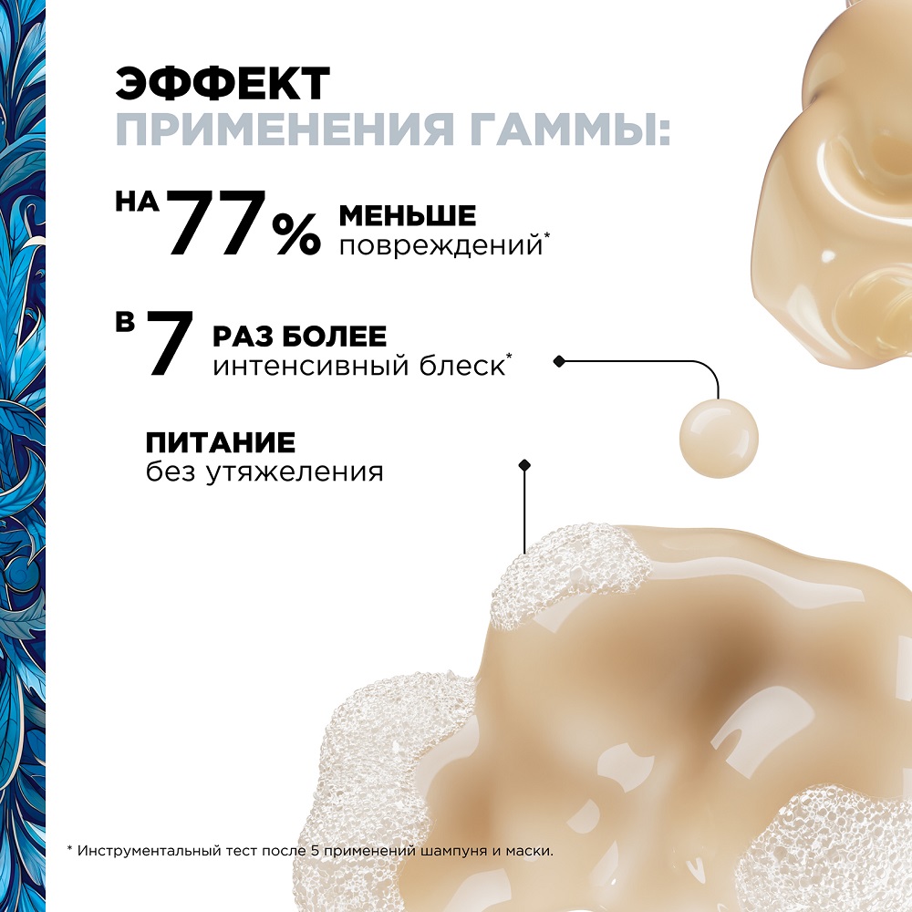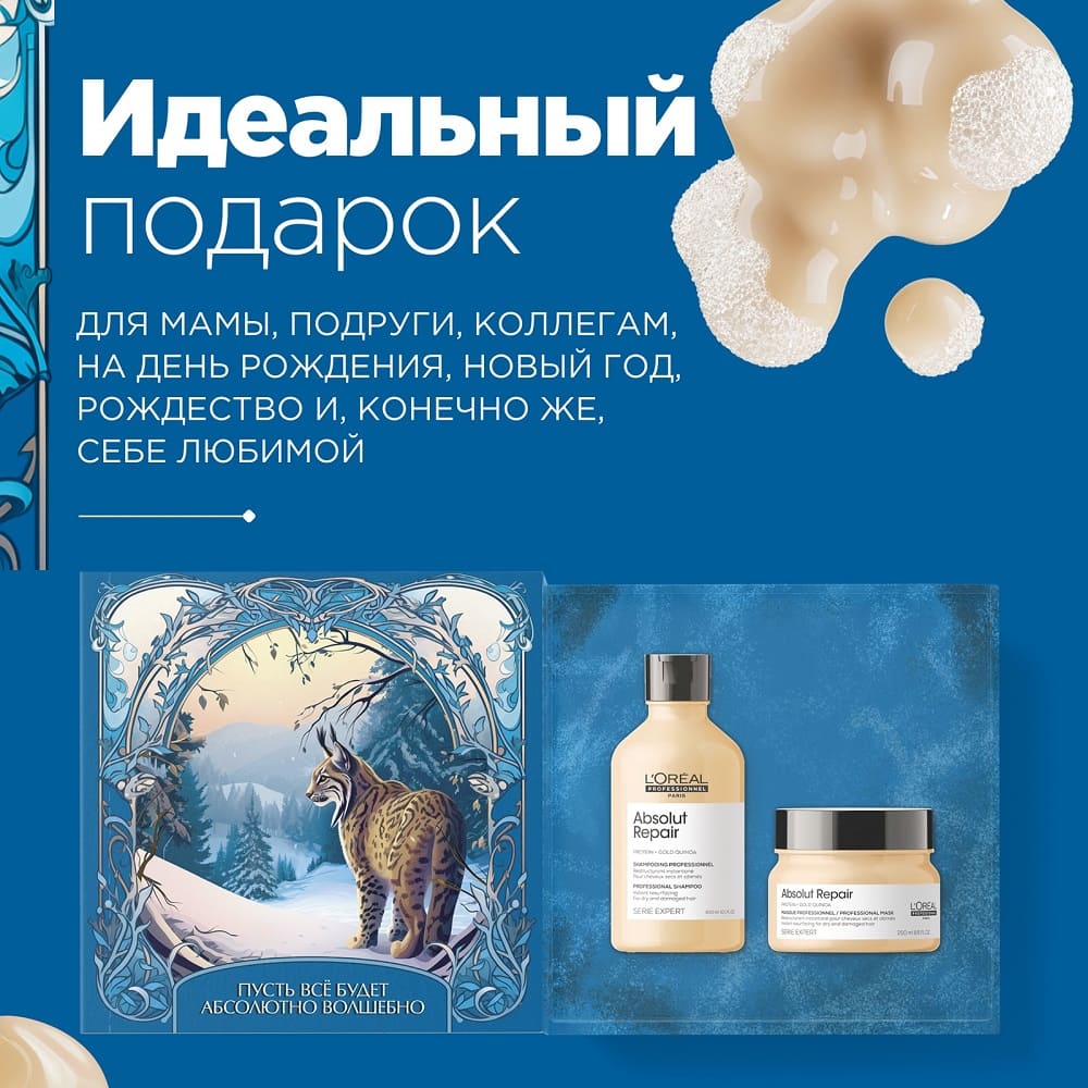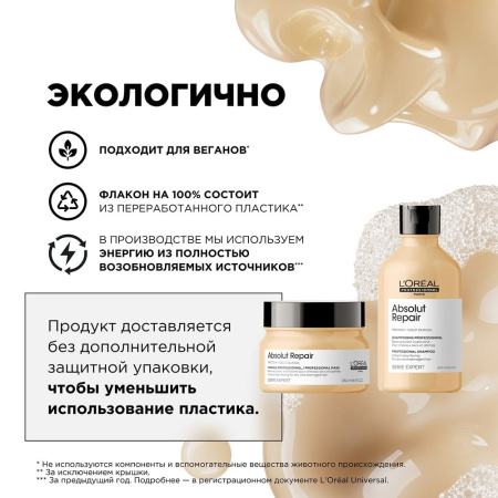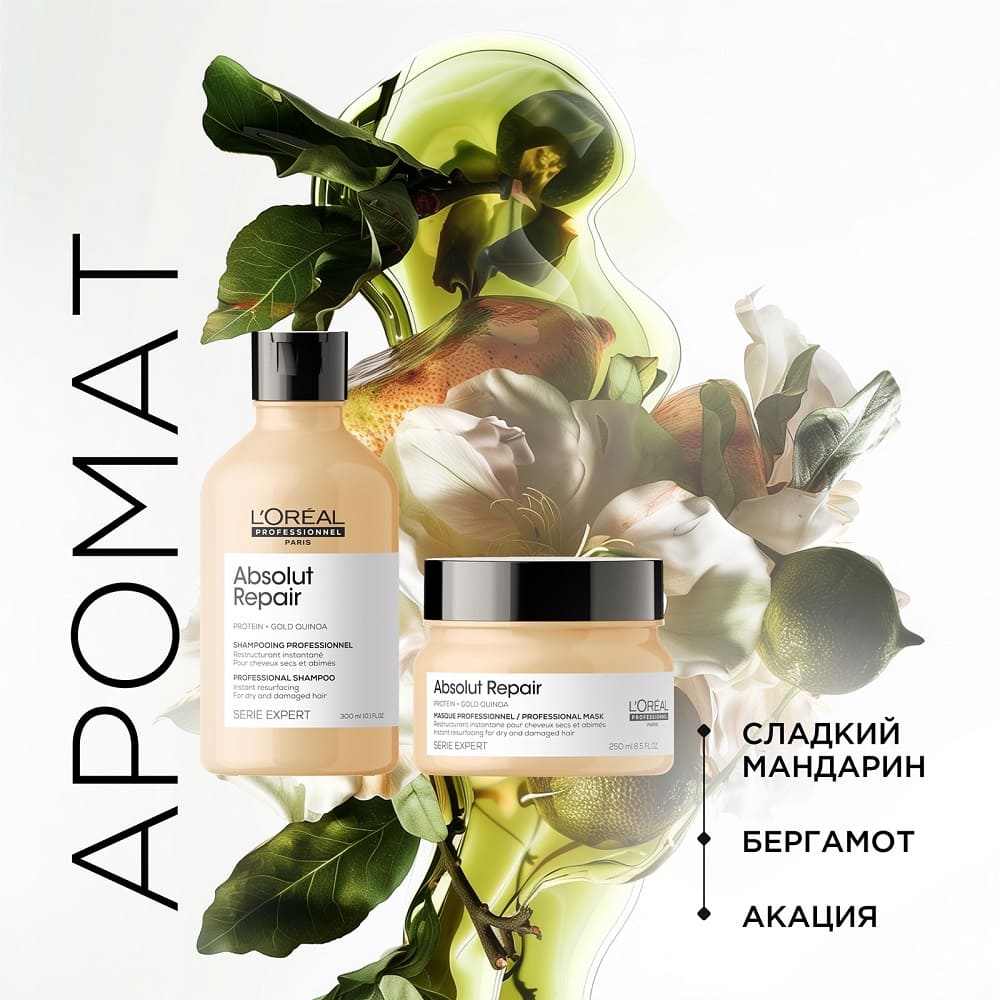 Волшебное средство, которое мягко очищает, освобождая кожу и волосы от загрязнений, не пересушивая и сохраняя естественную влагу. Легкая формула не утяжеляет, а эластичность и зеркальный блеск делают волосы по-настоящему восхищением. Аромат — это нежный шепот французской роскоши, который сопровождает вас каждый день. - Интенсивная забота — маска Serie Expert Absolut Repair, 250 мл