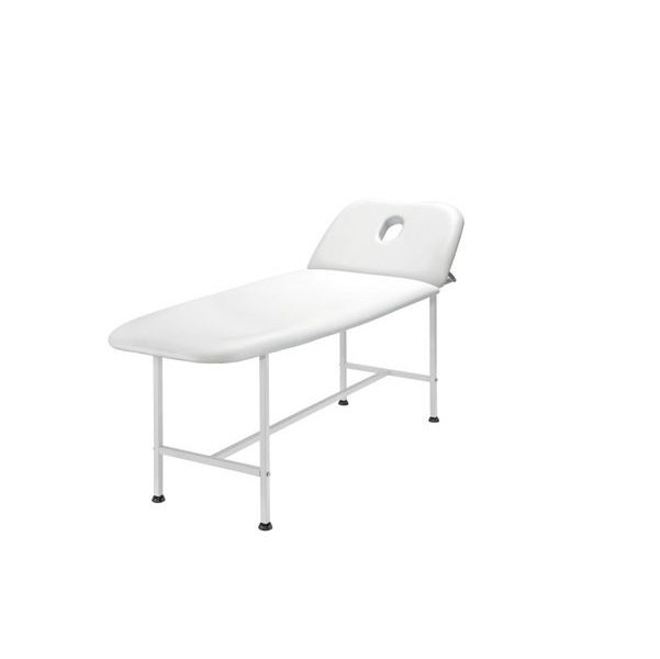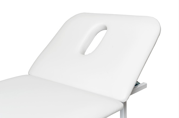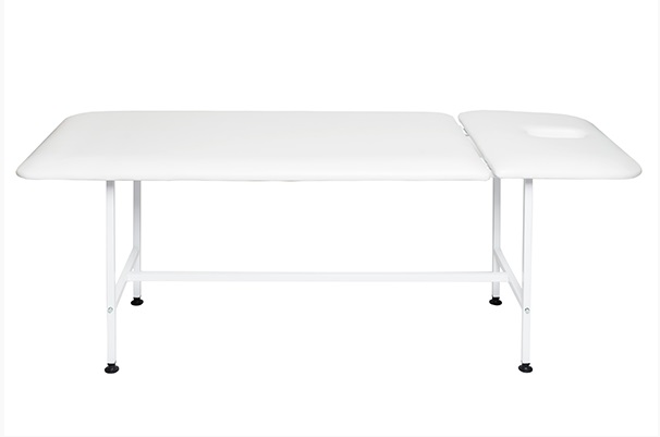 Кушетка на металлическом каркасе белого цвета с отверстием для лица и механической регулировкой подголовника.