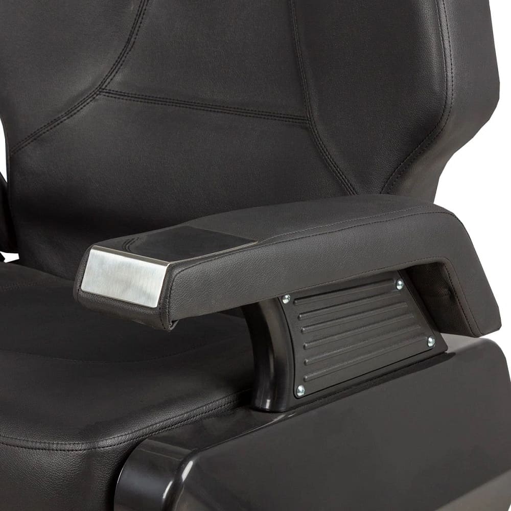 Массивное кресло оснащено удобными подлокотниками и мягким подголовником. Широкое посадочное место обеспечивает комфорт во время процедур. Практичная подножка помогает предотвратить усталость ног клиентов.
