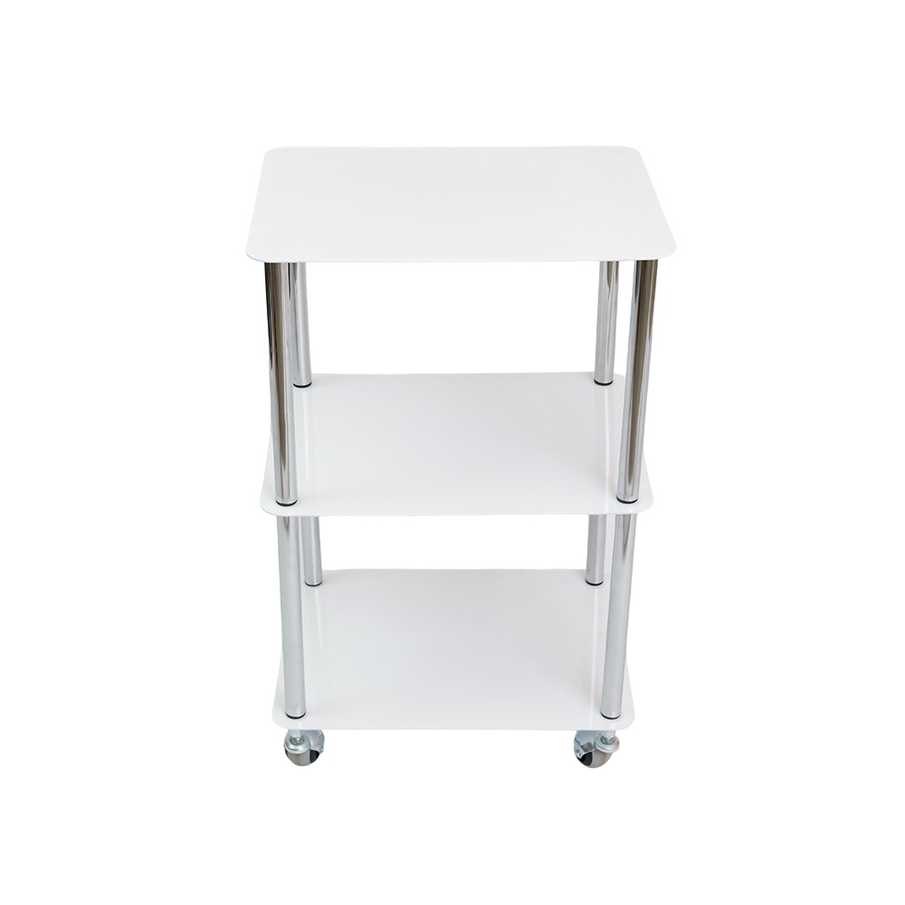 Тележка косметологическая на колесах, с тремя удобными полками для размещения рабочих инструментов, оборудования и различных аксессуаров. Каркас и полки тележки выполнены из металла.